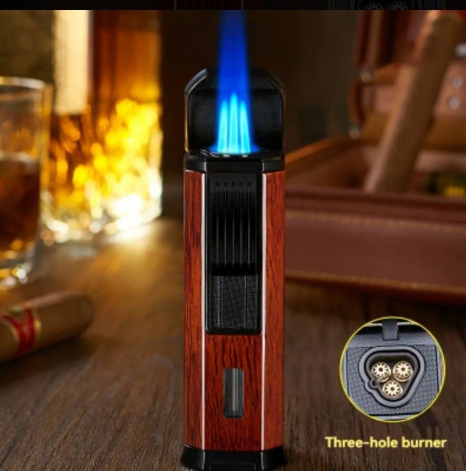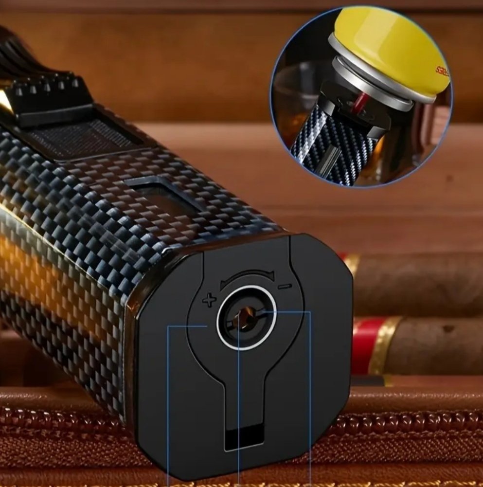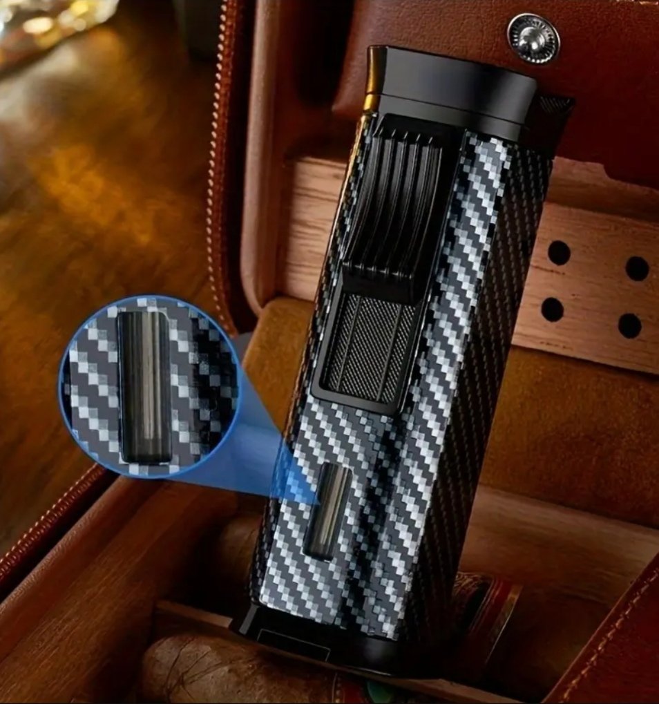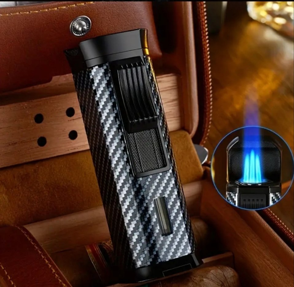 Potencia, diseño y resistencia en un solo encendedor. Este modelo de triple llama azul tipo antorcha garantiza un encendido rápido y eficiente, incluso en condiciones de viento fuerte. Su acabado estilo fibra de carbono aporta un toque moderno y sofisticado, ideal para quienes buscan estilo y funcionalidad.Tambien tiene su cortador .